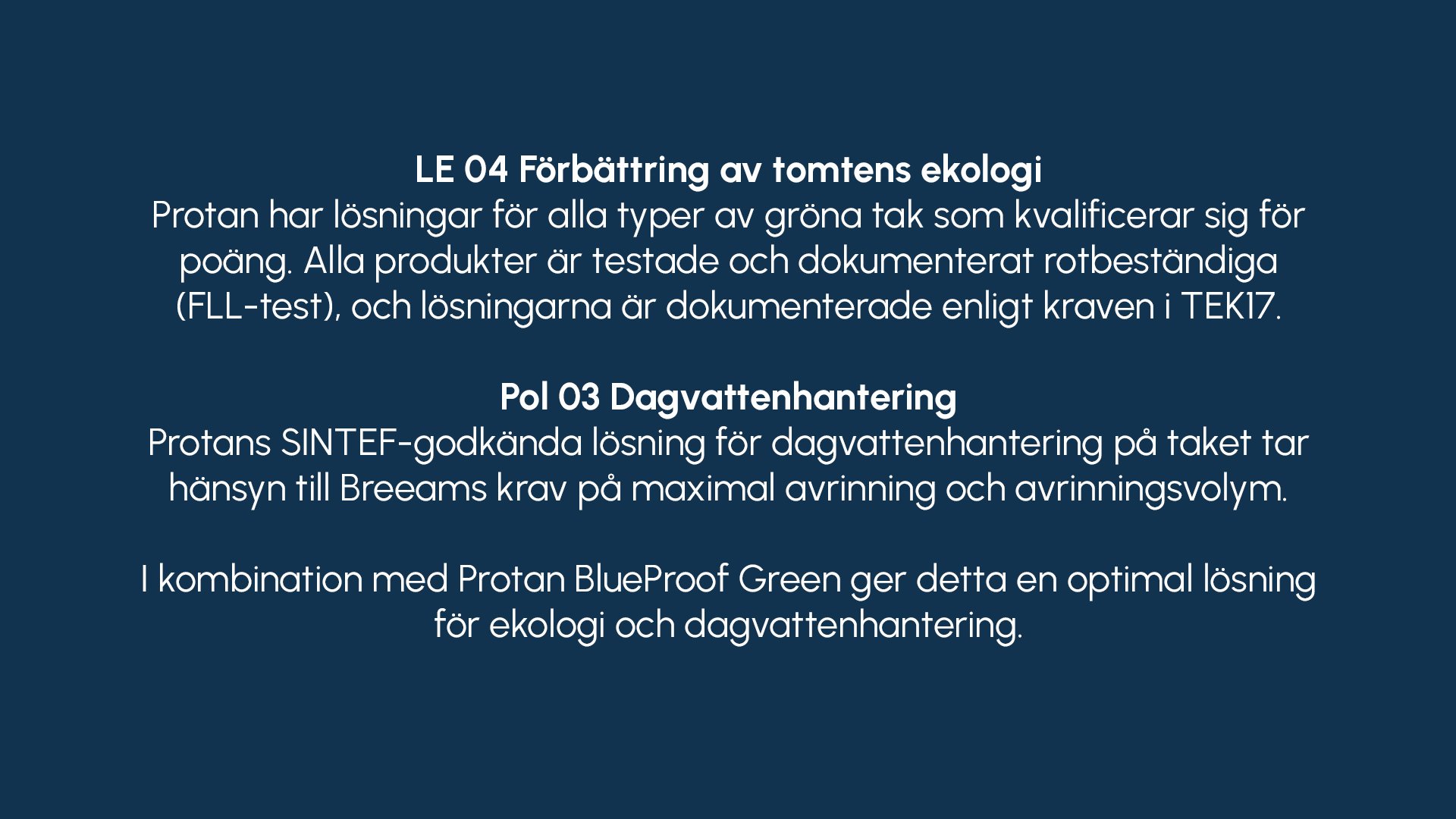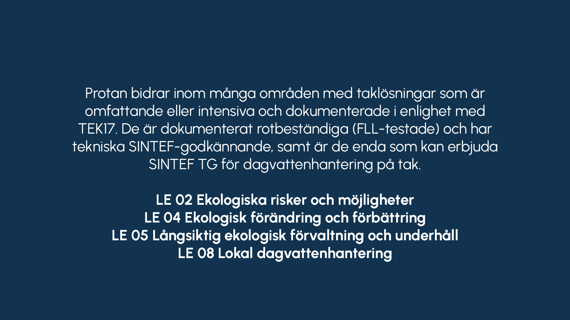 Protan bidrar till att förebygga översvämningar med dokumenterad dagvattenhantering på taken. Om detta kombineras med olika gröna tak uppnås hållbar markanvändning i kategorierna LE 04 – Förbättring av tomtens ekologi och Pol 03 – Dagvattenhantering.