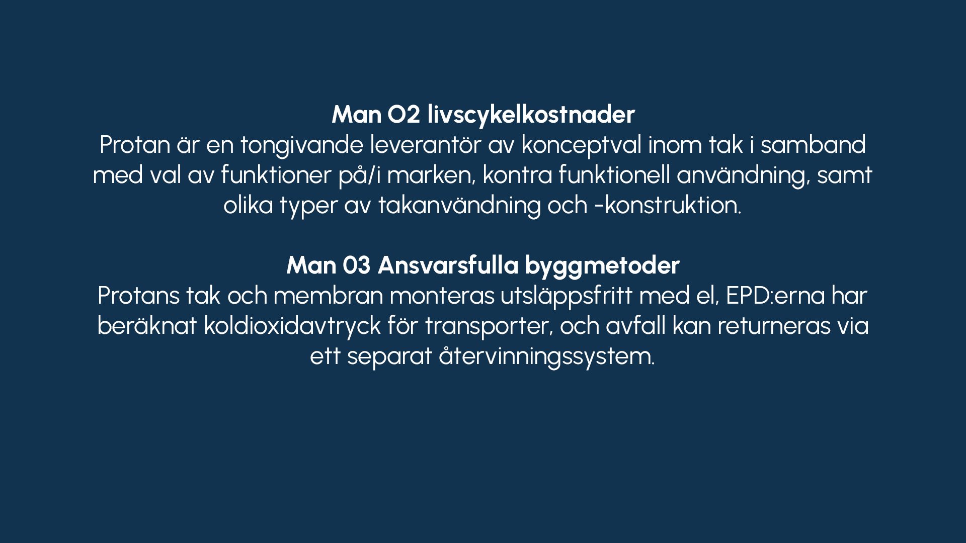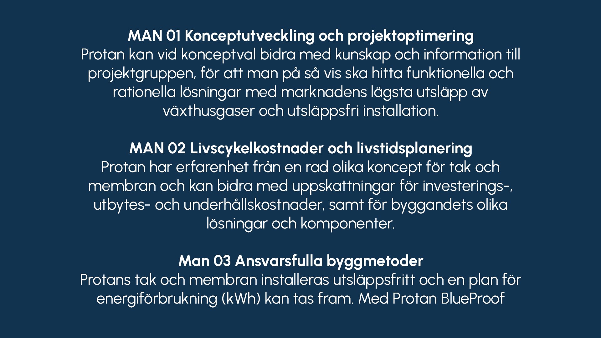 Protan bidrar till hållbara ledningsmetoder i kategorierna Man 01 Konceptutveckling och projektoptimering, Man 02 Livscykelkostnader och livslängdsplanering och Man 03 Ansvarsfulla byggmetoder och bidrar till att hållbarhetsmål uppfylls helt fram till byggnadsdriften.