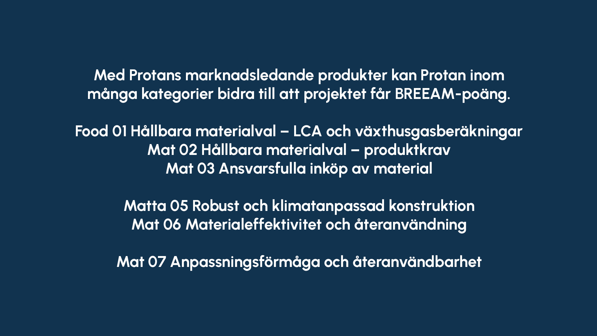Protan vill presentera hur vi kan hjälpa arkitekter, ingenjörer och andra yrkesverksamma inom ett BREEAM-NOR-projekt, och hur detta kan bidra till ett ökat antal poäng för projektet. Genom att använda Protans produkter och system kan hållbara materialval och ansvarsfulla inköp dokumenteras. Protan och Protans produkter och lösningar kan också bidra till att projektet tilldelas poäng i andra kategorier.