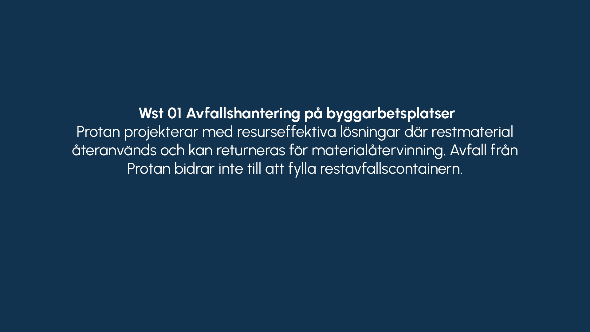 Protan bidrar till hållbar avfallshantering genom resurseffektiv projektering och genom att minska avfallsmängden på byggarbetsplatsen inom kategorin Wst 01 – Avfallshantering på byggarbetsplatsen.