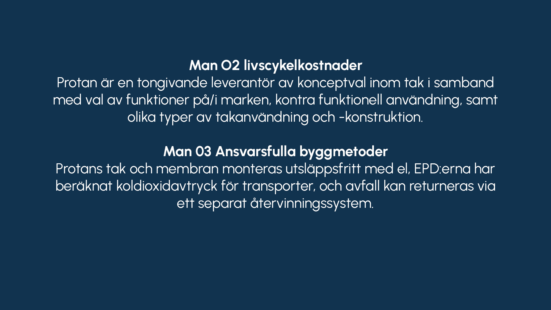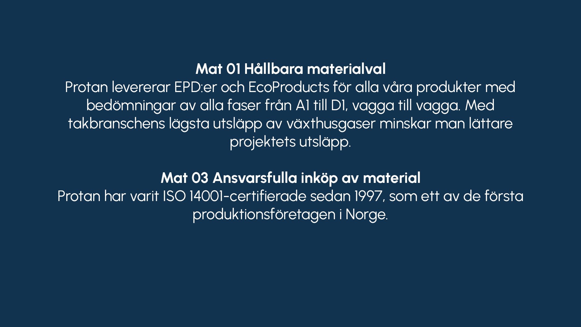 Protans materialeffektiva lösningar erbjuder takmarknadens lägsta utsläpp av växthusgaser under hela livscykeln. Protan kan bidra till minskad miljöpåverkan i kategorierna Mat 01, Mat 02, Mat 03, Mat 05, Mat 06 och Mat 07.