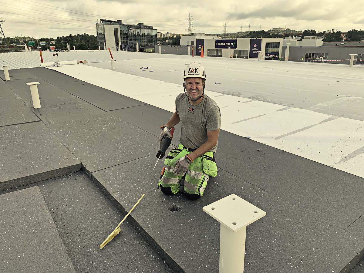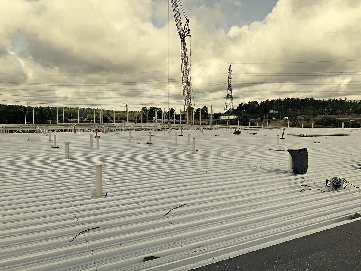 Taktema i Mälardalen lägger taket på en ny handelsplats, Häggvik Entré i Sollentuna. En nybyggnation och tillbyggnad på 17 500 kvadratmeter. Taket byggs upp med stålunderlagsboard, cellplast och Protan SE-B som har bedömningen B i Sunda Hus, är accepterad i Byggvarubedömningen och är BASTA registrerad.