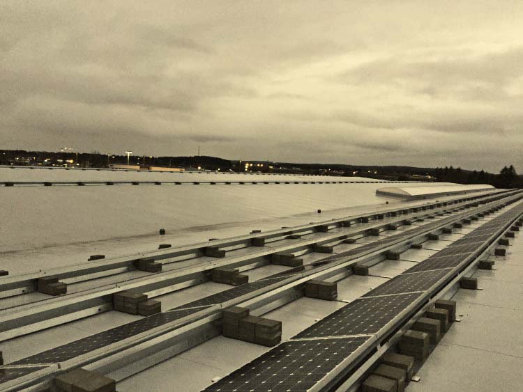 Referensbilden föreställer Martin & Serveras logistikanläggning i Umeå som byggdes med hjälp av bland annat Axfast och Taktema med en installation av ca 2 500 kvm solceller på taket för egen elförbrukning. Byggherre var AxFast som också äger och förvaltar byggnaden, som certifierades enligt Breeam med nivån Very Good.