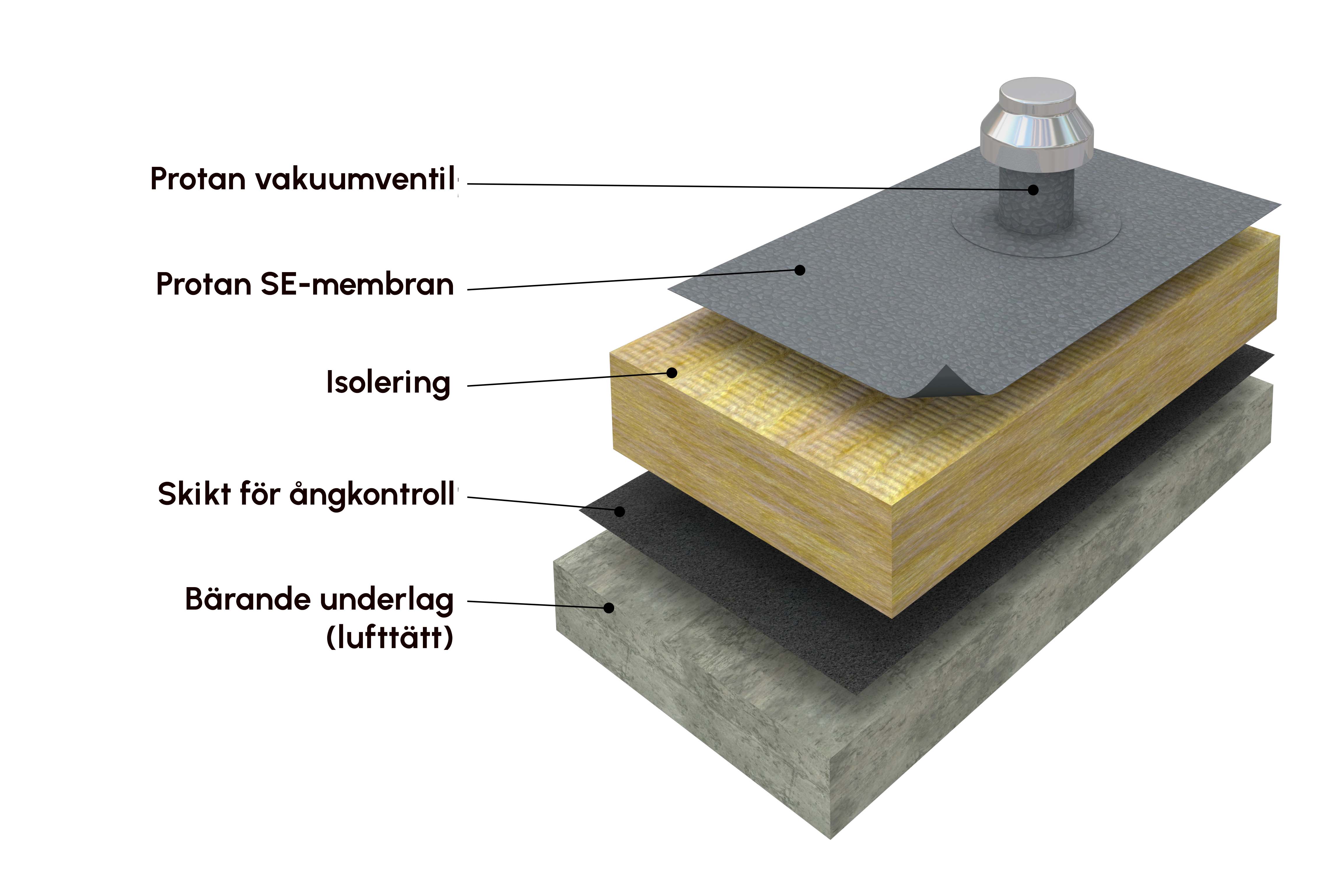 Ett Protan-godkänt, brännbart, bituminöst ångkontrollskikt installeras över det lufttäta strukturella takdäcket, följt av Protan-godkänd isolering och Protan SE- eller EX-monolagsmembran.