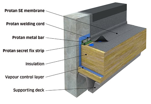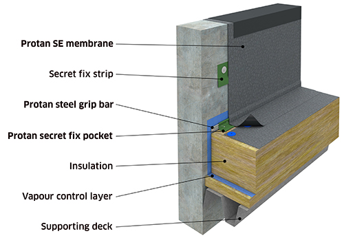 Vindkrafterna på ett tak är starkare vid takkanten. En takkant med upphöjning kallas parapet. Skador orsakade av vind kan lätt uppstå om takbeklädnaden inte är ordentligt säkrad. Vårt system är en kombination av Protan Steel Bar och vår prefabricerade Parapet Skirt med en svetsad remsa eller ficka.